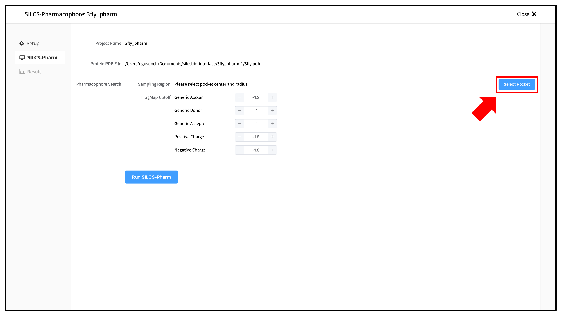 Once all information is entered correctly, press the “Setup” button at the bottom of the page. The screen will update to add “Pharmacophore Search” to the list of information. Click the “Select Pocket” button on the right-hand side of the window.