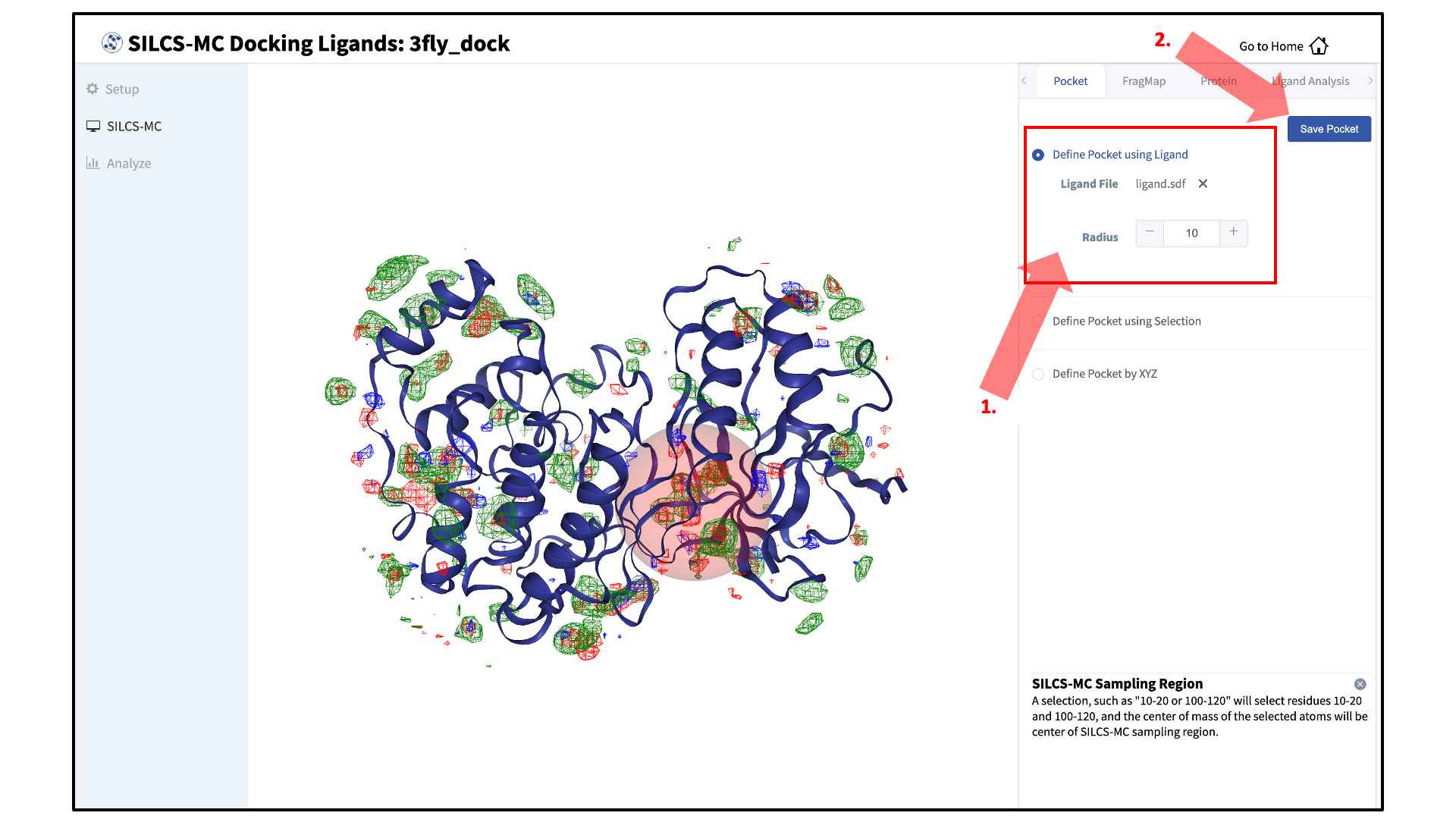 Adjusting the radius of the spherical pocket may negatively impact the SILCS-MC sampling. Using a radius smaller than the default 10 Å reduces the size of the sampling region, which may disallow the generation of sufficient number of conformations leading to the optimal binding pose being missed. Using a radius larger than the default 10 Å increases the size of the sampling region, thereby increasing the computational cost and time of the SILCS-MC docking runs and increasing the number of irrelevant binding poses.