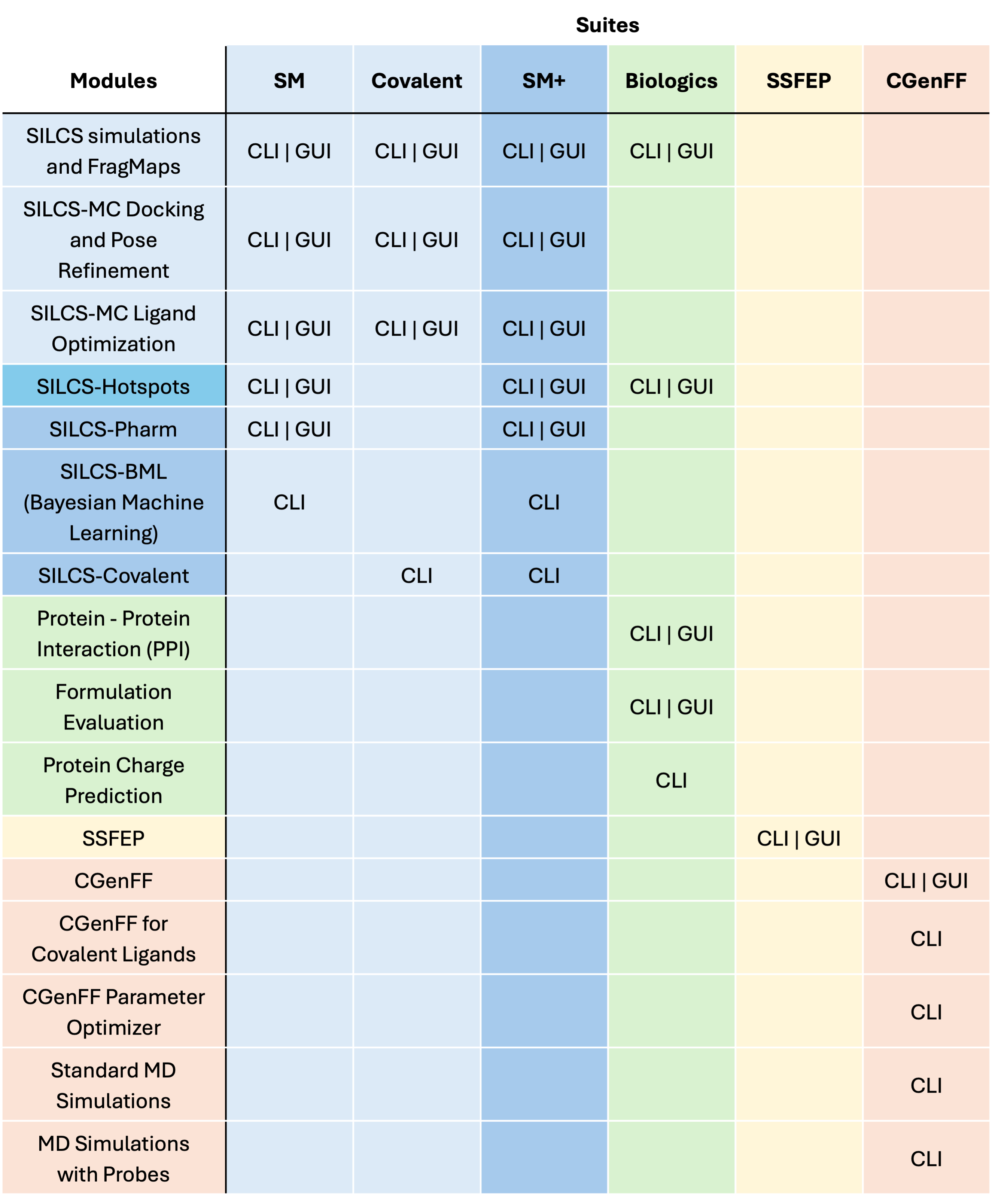 The suites and their included features and modules are listed in the table below. Features marked with “CLI” are available only in the command line interface, and features marked with “CLI | GUI” are available in both the command line interface (CLI) and the SilcsBio graphical user interface (GUI). If you have any questions about the suites or any particular feature, please contact info@silcsbio.com.