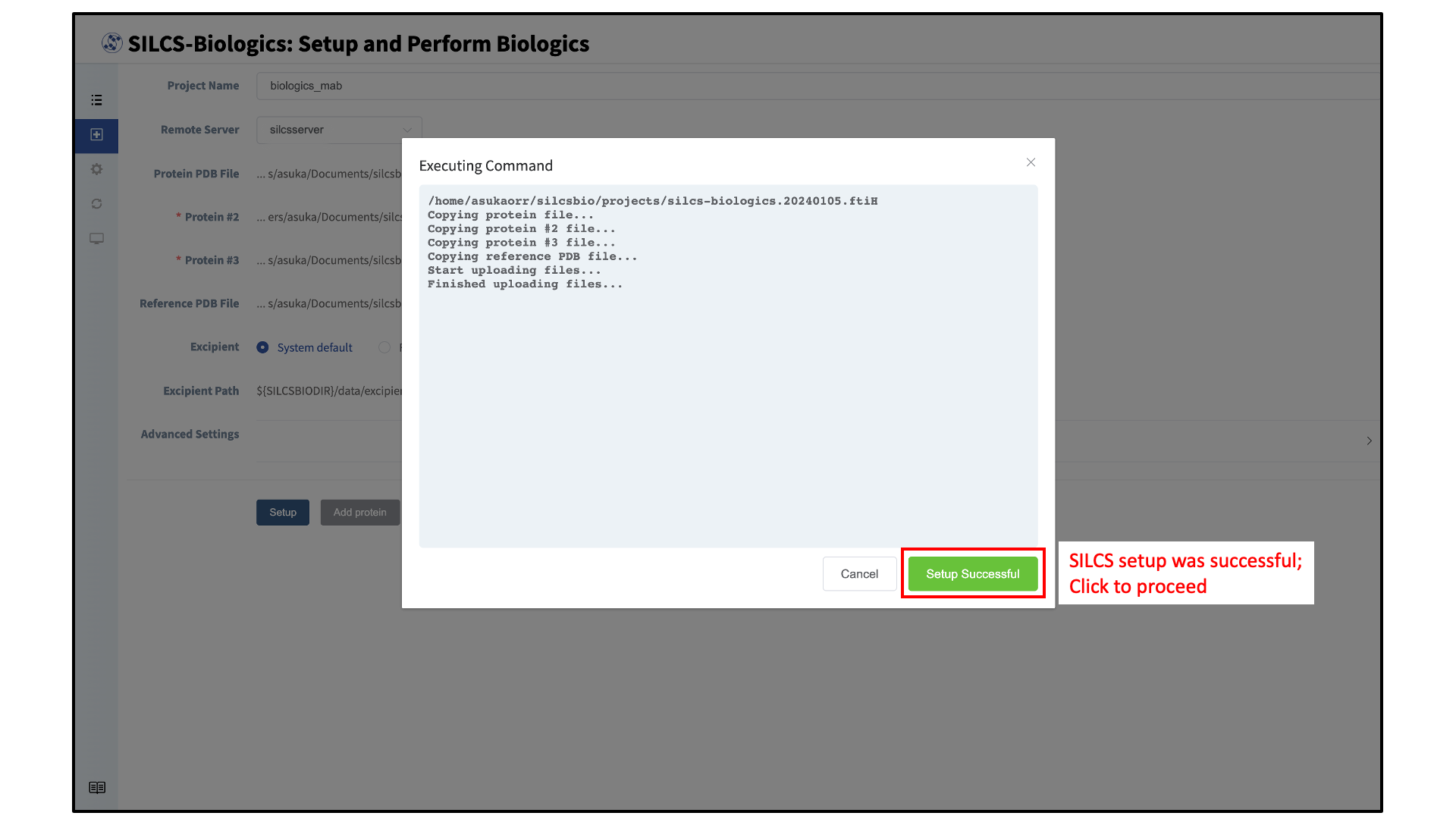 During setup, the program automatically performs several steps including building the topology of the simulation system and creating metal-protein bonds if metal ions are found. To complete the entire process may take up to 10 minutes depending on the system size. A green “Setup Successful” button will appear once the process has successfully completed. Press this button to proceed.