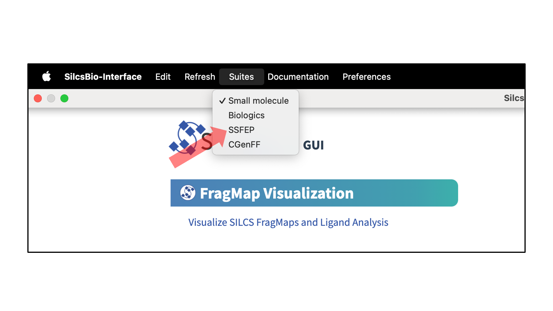 SilcsBio GUI users can access the SSFEP Suite by selecting from the menu bar.